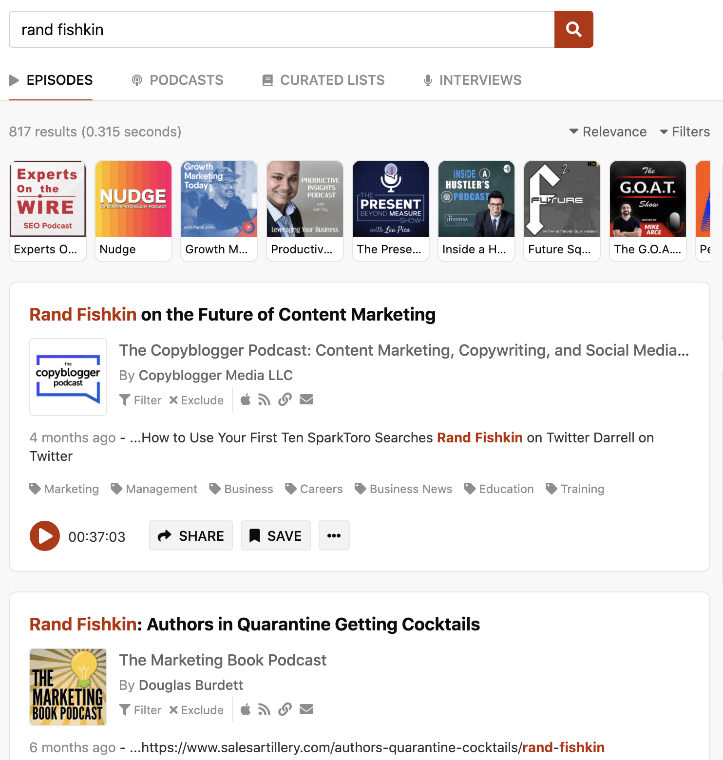 PodChaser also allows you to search for someone and pull up a curated list of their guest appearances in a special tab.